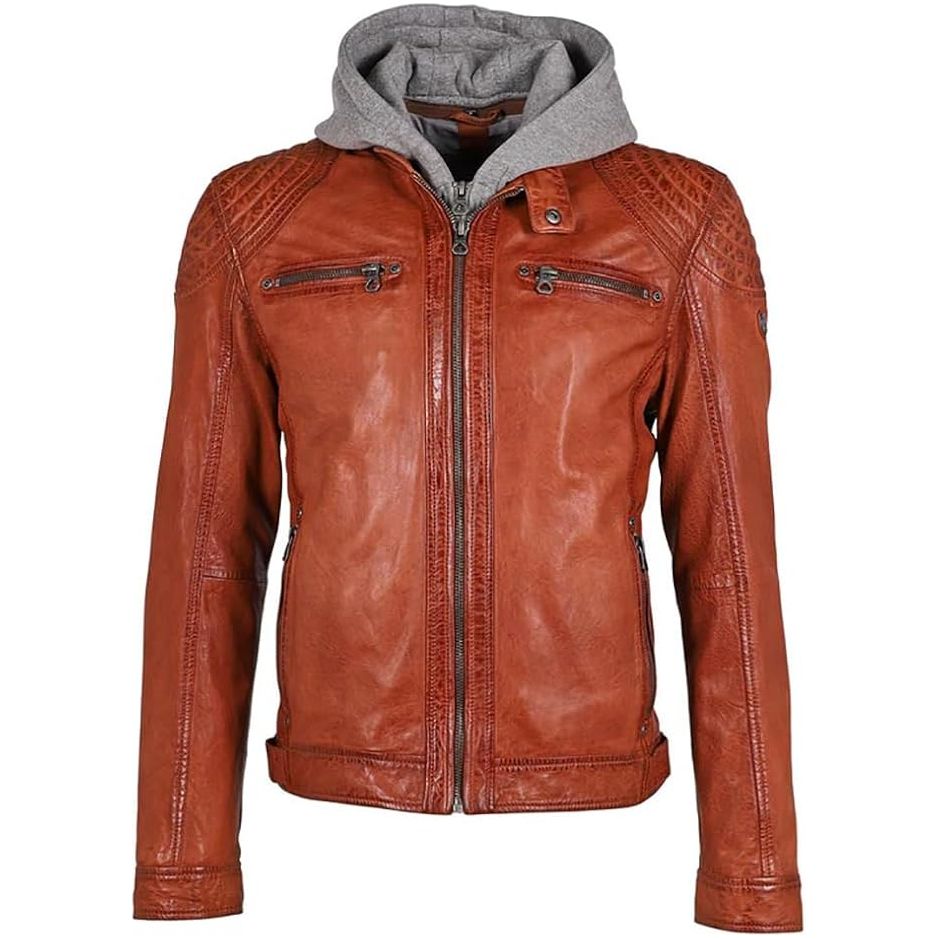This Men's Leather Jacket combines fashion and function in one versatile piece. Crafted from smooth brown lamb leather, it features a removable zip-out hoodie to keep you warm in any weather. The classic moto jacket style makes a statement while its tailored fit and supple leather provides all-day comfort.