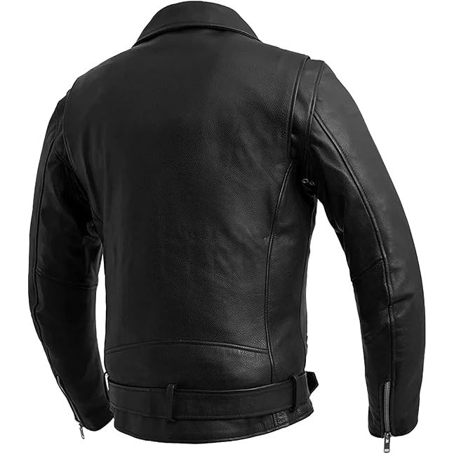 Ideal for motorcycle enthusiasts seeking both style and functionality, this Genuine Leather Motorcycle Jacket from First Manufacturing combines rugged durability with essential features for a confident and comfortable ride.