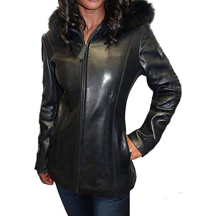 Mason & Cooper Women's Fox Trim Hooded Genuine Leather Jacket