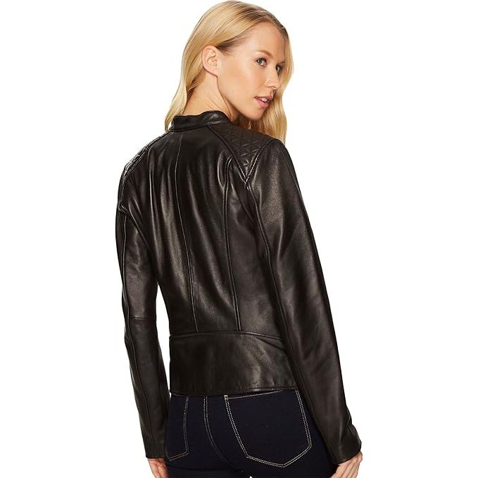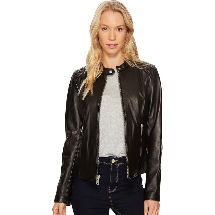 The racer jacket you'll reach for again and again. Crafted in ultra-lightweight lambskin leather, the Goldie features exposed silver hardware at the front zipper closure and pockets. It's flattering stand collar, enhanced by the tumbled silver metal snap, contributes to the edgy, sleek styling. True-to-style signature pyramid quilting at the shoulder adds texture and appeal to this year-round jacket.
