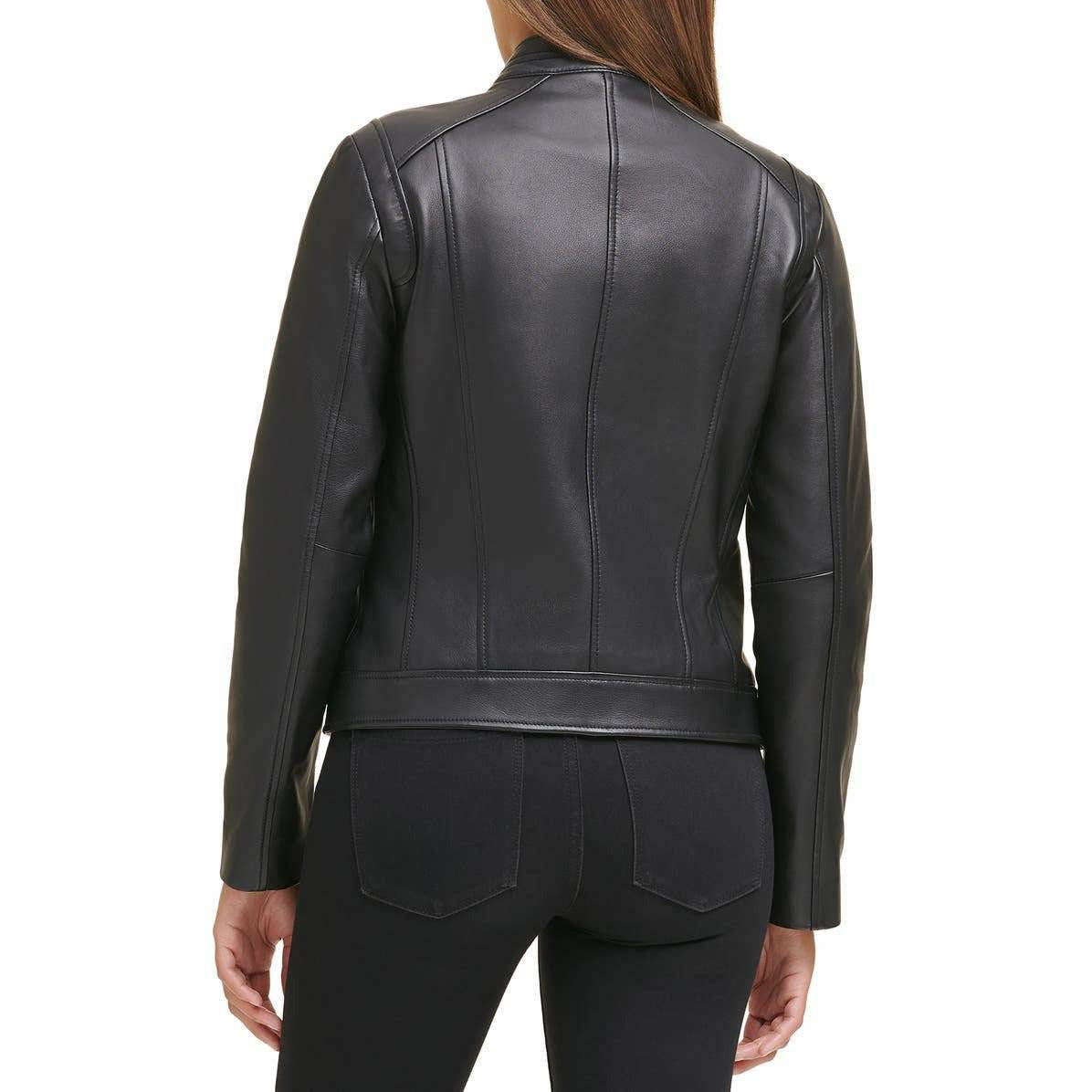 Turn heads in the Women's Moto Leather Jacket, crafted from 100% genuine lamb leather for a luxuriously soft feel and premium finish. This elevated take on the classic moto jacket features a snap collar, zipper chest pocket, and side-entry pockets, blending edgy style with everyday functionality.